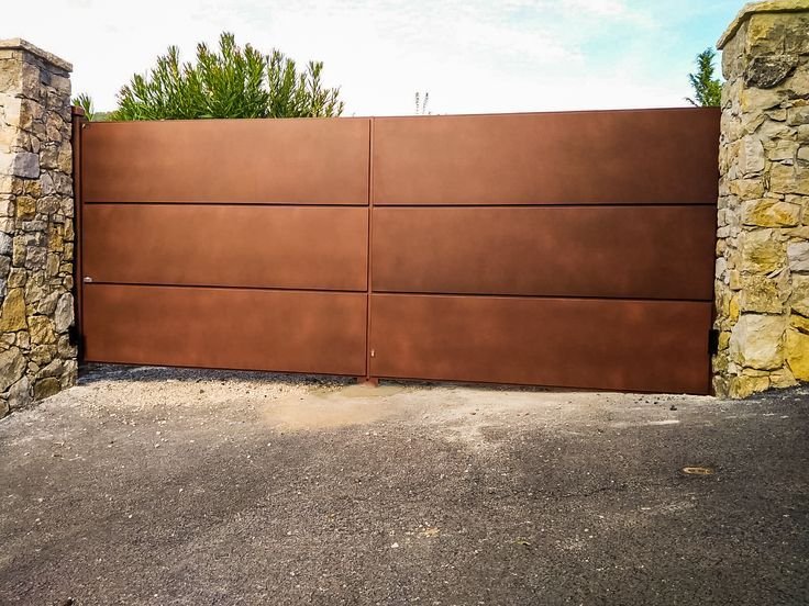 A sofisticação do acabamento em aço corten confere um visual imponente e contemporâneo. O design sólido garante total privacidade, unindo a estética e a alta segurança.