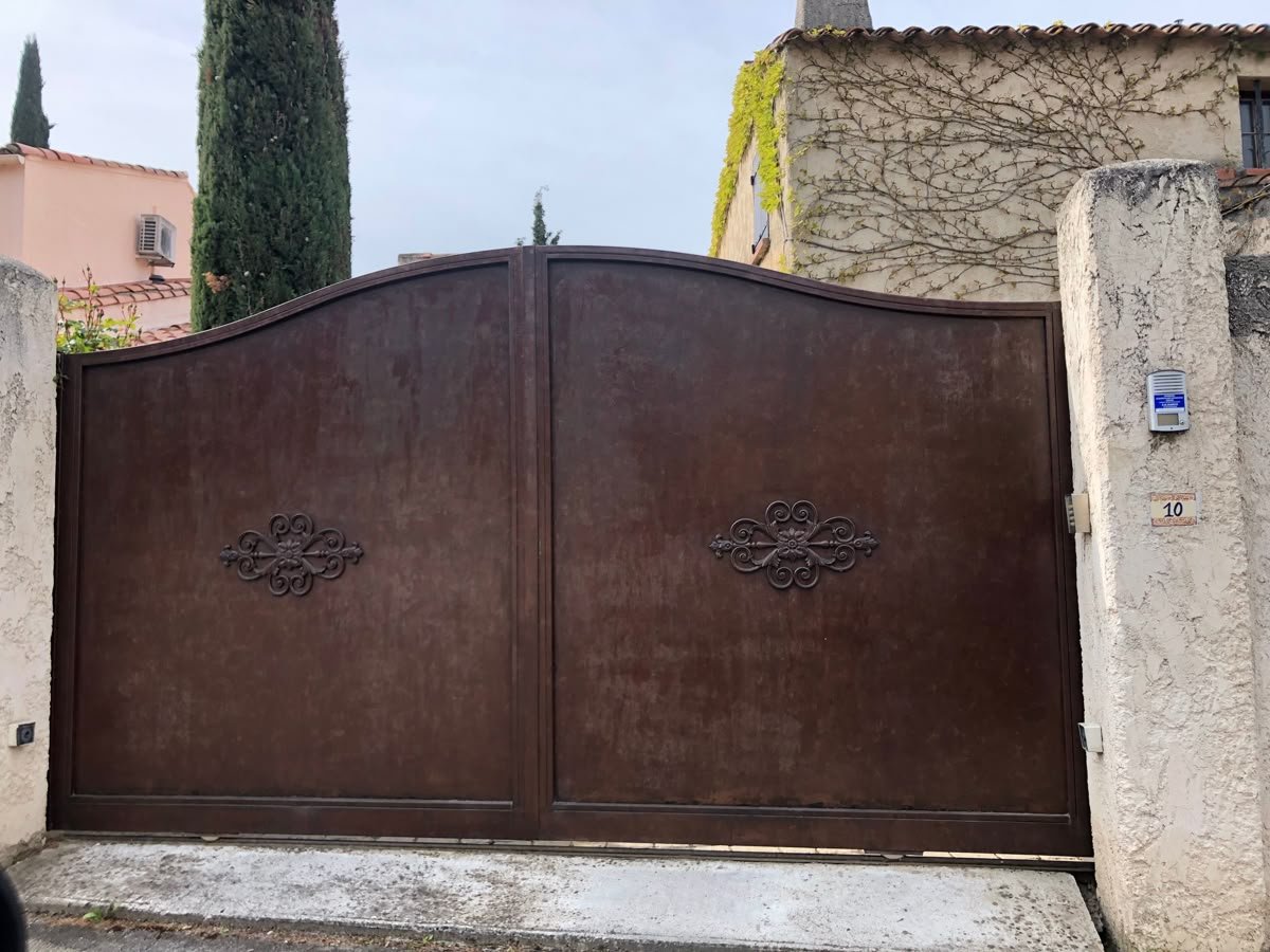Este portão de entrada combina a robustez do metal com o acabamento único do aço corten. O design curvo e os detalhes ornamentais centrais criam uma estética muito imponente.