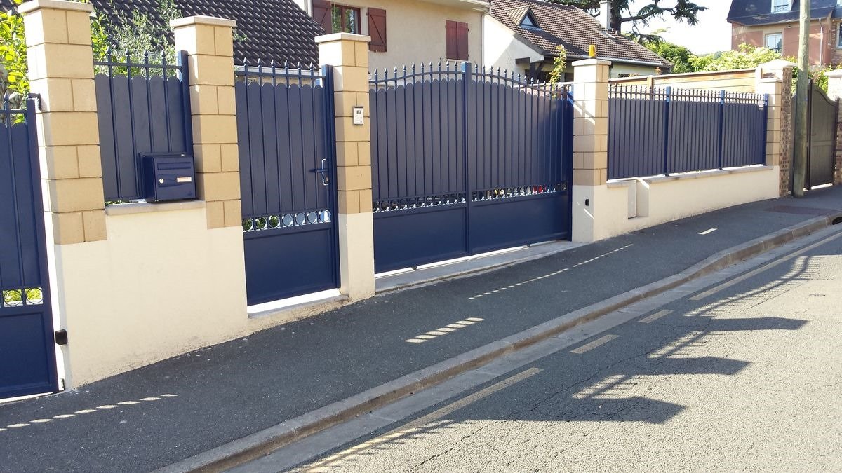 Este projeto une design moderno e máxima proteção. O portão deslizante e a vedação em azul-escuro sobre base clara criam uma barreira robusta e muito elegante.